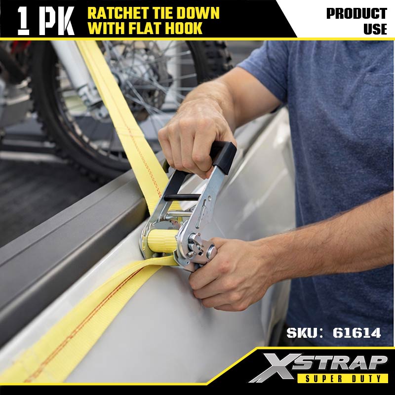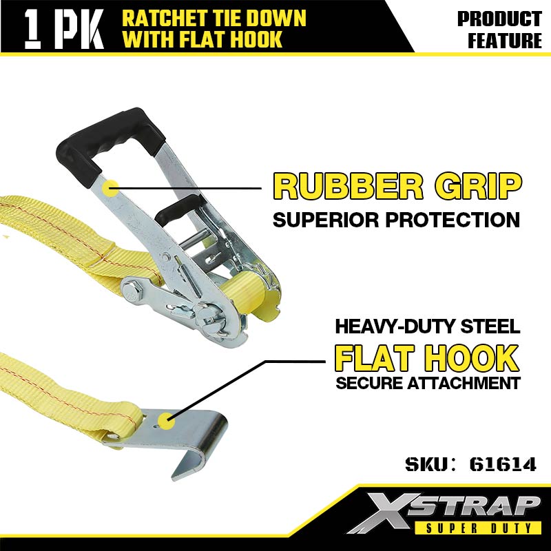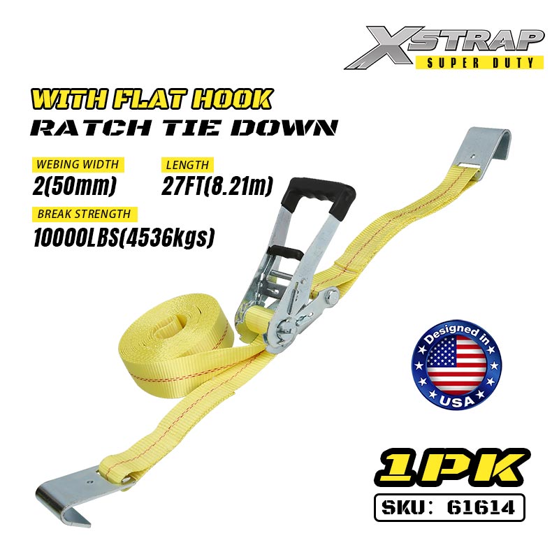 Xstrap Ratcet lekötő lapos horgokkal, 2” x 27 hüvelykes poliészter rögzítőszíj, racsnis pánt, 3333 font teherbírású rakományrögzítő rögzítő hevederek lapos horgokkal nagy teherbírású utánfutókhoz, síkágyas utánfutóhoz, sícsónakhoz, kisautóhoz, nehéz felszerelésekhez.