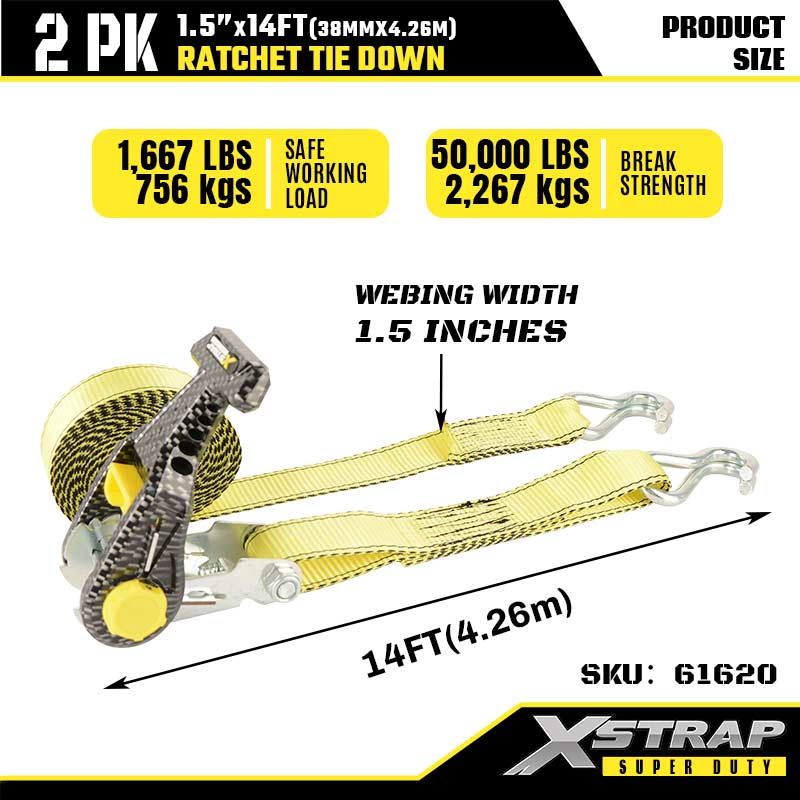 Xstrap 2PK Ratcet lekötő dupla J horgokkal, 1-1/2” x 14”-es poliészter rögzítőszíj racsnis heveder, 1667 font teherbírású teherrögzítő rögzítő hevederek dupla J horgokkal nagy teherbírású utánfutóhoz, síkágyas utánfutóhoz, síkágyas utánfutóhoz.