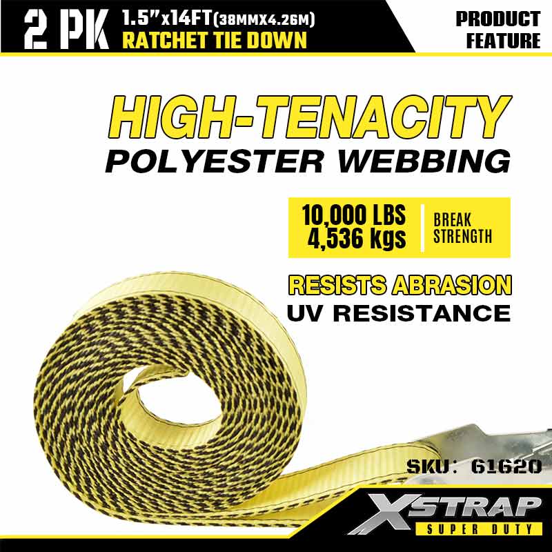 - Nagy szakítószilárdságú poliészter heveder: A 1,5 hüvelyk széles poliészter heveder fekete és sárga szövésű, ellenáll a kopásnak, nyúlásnak és kopásnak. Ellenáll az UV-sugárzásnak, ellenáll a napsütésnek és az esőnek, így marad a munkahelyeken vagy a hátsó utakon.