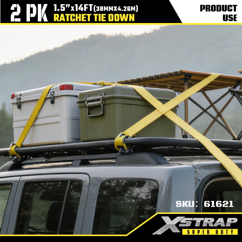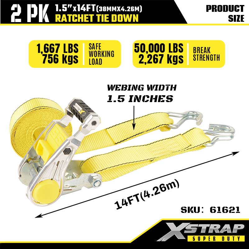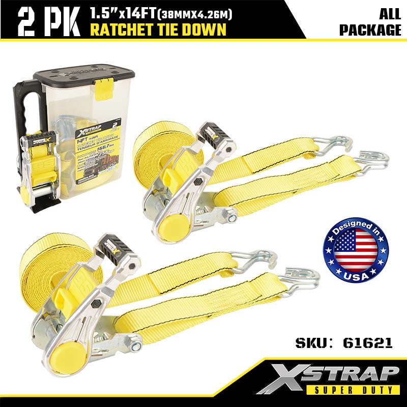 Xstrap 2PK Ratcet lekötő dupla J horgokkal, 1-1/2” x 14”-es poliészter rögzítőszíj racsnis heveder, 1667 font teherbírású teherrögzítő rögzítő hevederek dupla J horgokkal nagy teherbírású utánfutóhoz, síkágyas utánfutóhoz, síkágyas utánfutóhoz.
