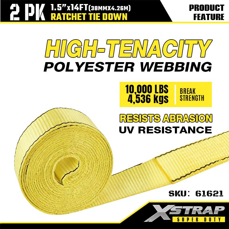 - Nagy szakítószilárdságú poliészter heveder: A 1,5 hüvelykes széles poliészter heveder ellenáll a kopásnak, nyúlásnak és UV-sugárzásnak, így ellenáll a napsütésnek, az esőnek és a durva terepen. Elég szívós az építőanyagokhoz, és elég gyengéd ahhoz, hogy megvédje kültéri felszerelését a karcolásoktól.