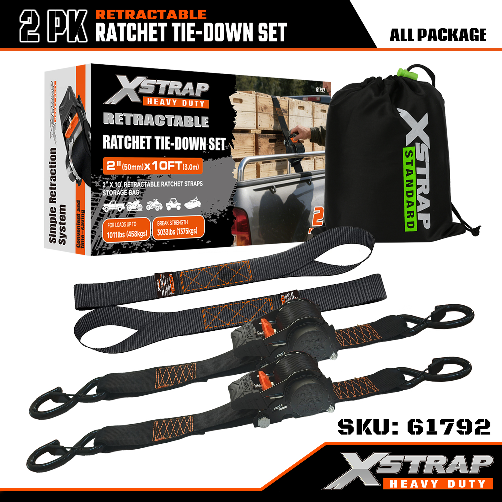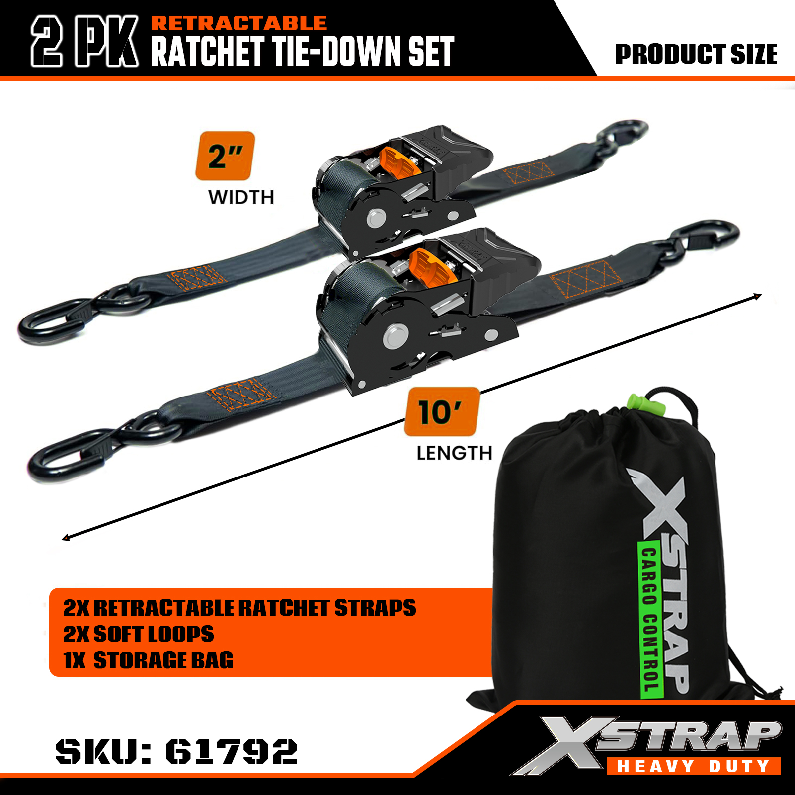 Xstrap 2PK visszahúzható racsnis rögzítőkészlet biztonsági S horgokkal, 2” x 10” poliészter rögzítőszíj racsnis heveder, 1011 font teherbírású rakományrögzítő rögzítő hevederek biztonsági S horgokkal teherautóhoz, rakomány utánfutóhoz, motorkerékpárhoz.